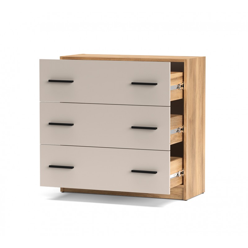 La Cómoda 3 Cajones Elba es una pieza práctica y moderna diseñada para aportar orden y estilo al dormitorio. Sus tres cajones amplios permiten almacenar ropa, complementos y objetos personales de forma cómoda y accesible, aprovechando el espacio sin recargar la habitación.