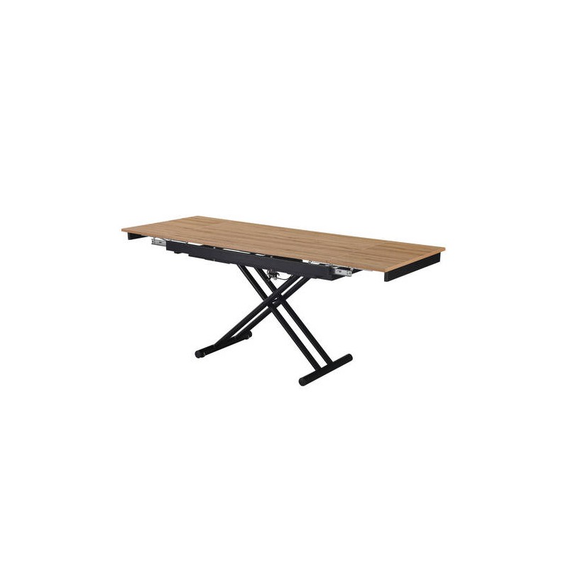 Mesa de centro/comedor de altura regulable, con sistema de elevación asistida mediante pistón de gas y extensibles en cada extremo del sobre. Sobre de melamina acabado en color roble amazonia y patas metálicas de color negro.