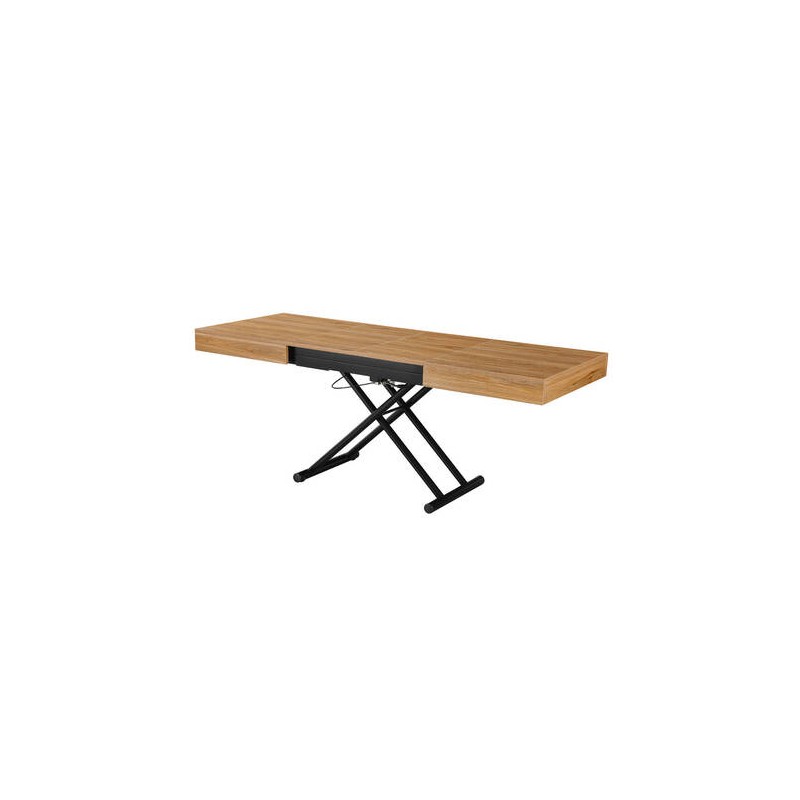 Mesa de centro/comedor de altura ajustable, con sistema de elevación asistida mediante pistón de gas. Sobre y faldón de melamina color elegant con dos tableros extensibles con mismo acabado. Estructura metálica negro mate.